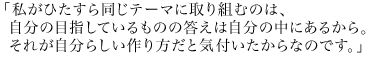 以前はいろいろありました、野望が(笑)。百貨店に出せるようになりたいとか、海外で出せるようになりたいとか、外に向けての事ばかり考えていたのです。 今は、自分の目指しているものの答えは自分の中にあるのだと気付いて。私がひたすら同じ作品のマイナーチェンジを繰り返すのもそんな気持ちから。そういうことを続けているのが、自分らしい作り方なのかなって思っています。