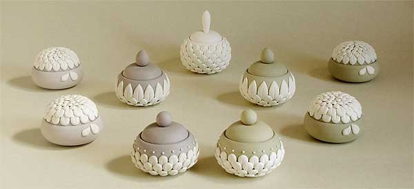研究生の頃は、鋳込みというのは量産の手段として考えていたのですが、デザインコース1年から2年にあがる春休みにヨーロッパの窯を巡る旅に行って見方が変わりました。そこで見たやきものは、アートピースに近いようなものを型で作っていたのです。型が手作りの少量生産になってもいいのだと感じてから、花びらのようなピースをぺたぺたと素地に貼るようになり、今の蓋物の作品につながりました。 旅に行った当時は特に何も感じなかったのですが、今になって思うとその旅がすごく作品に影響していますね。見てきたものが、何年もかかってジワジワ表に出て来ている感じというか。