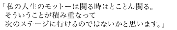 より良いものを作りたいという思い。作り続けること、関わり続けるということですね。 それは仲間や環境を作っていくことでもあります。ただ、それは持とうとしないと持てないものですし、多少何かに根ざすということも大事かもしれない。 私の人生のモットーは関わる時はとことん関わる。そういうことが積み重なって次のステージに行けるのではないかと思います。