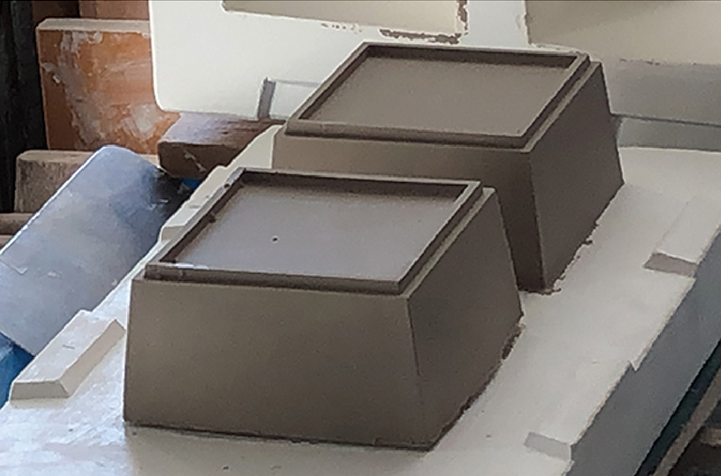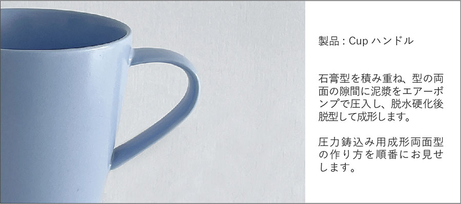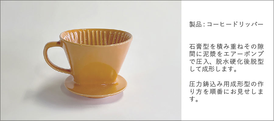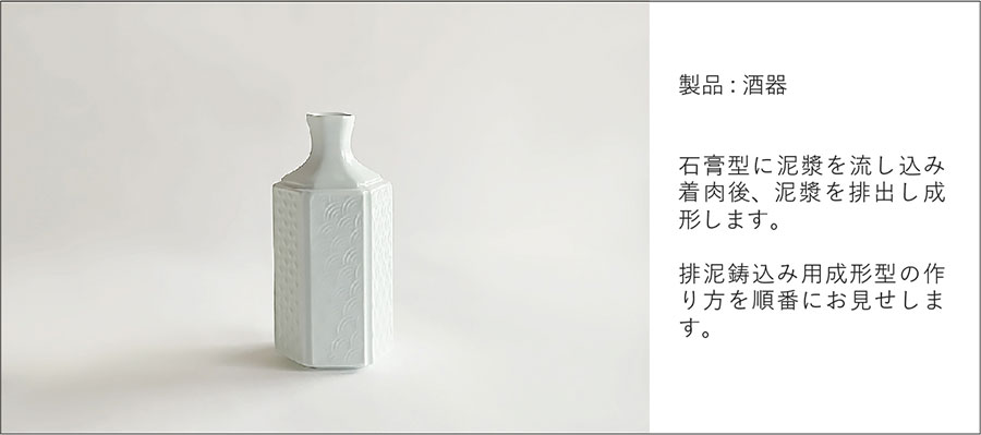 石膏の吸水性を利用して、石膏型に泥漿(液状の土)を流し込み成形する技法。 少量〜中量生産に適している。