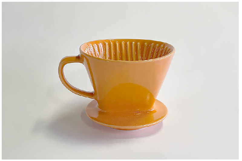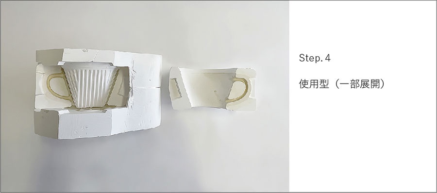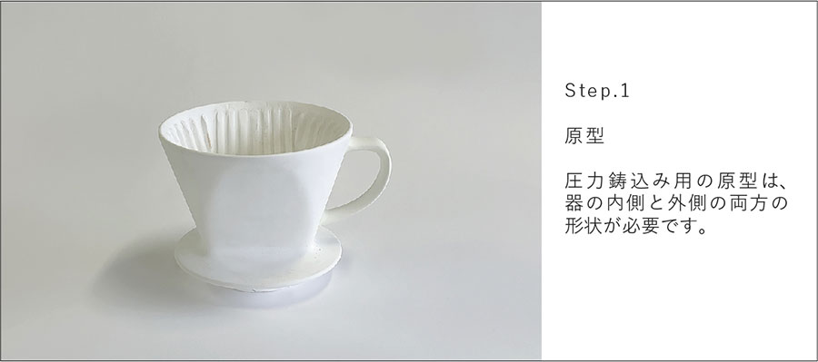 石膏型を積み重ねその隙間に泥漿をエアーポンプで圧入、脱水硬化後脱型する方法です。求める外側、内側の形状の隙間に泥漿を圧入することから、二重鋳込み成形法とも言われます。泥漿を強制的に圧力をかけて注入するため、生素地は焼成時の変形が少なく正確な仕上がりの製品を得られます。上下2つ割りの型がよく使われていますが、上下・側面の4つ割りの型を例に、ドリッパーの石膏型ができるまでを紹介します。