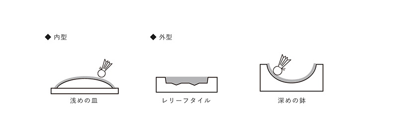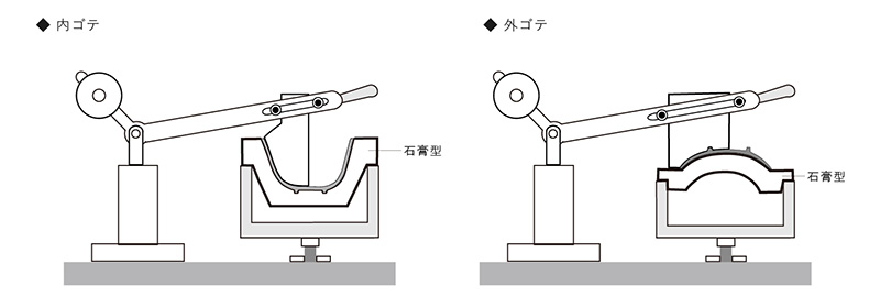 陶磁器の器物を多量に生産するとき、石膏で成形用の石膏型を作り成形します。円形の器類は、機械ロクロ用成形型、角型など変形させた器類は、排泥鋳込み用成形型、圧力鋳込み用成形型でそれぞれ石膏の吸水性を利用して成形します。現在、量産の現場における石膏成形方法は主に「タタラ型成形」「押し型成形」「機械ロクロ(水ゴテ)成形」「ローラーマシン成形」「排泥鋳込み成形」「圧力鋳込み成形」の6種類です。これらの成形方法は求める器の形状、生産個数、生産設備などによって使い分けられています。