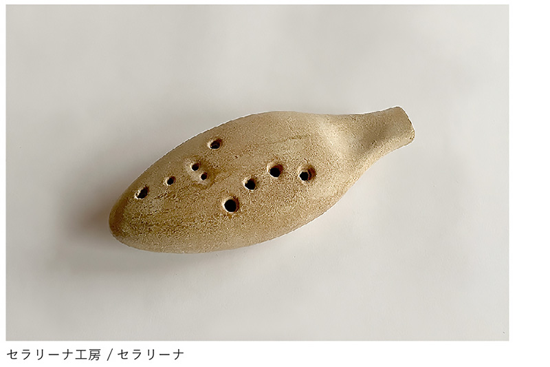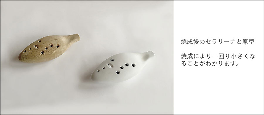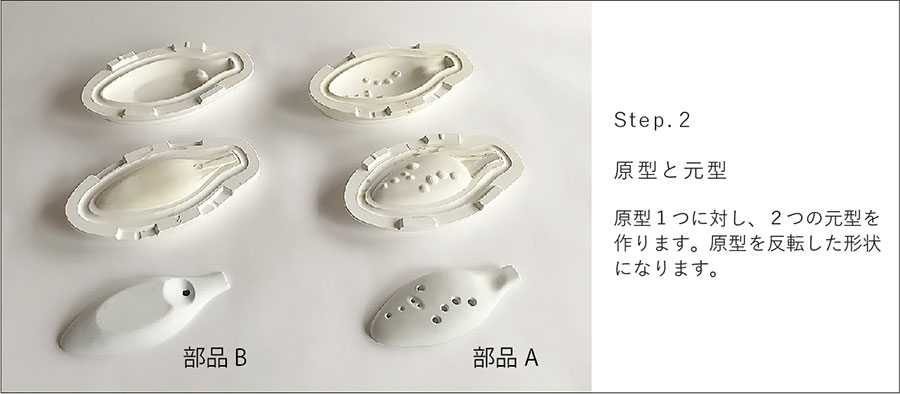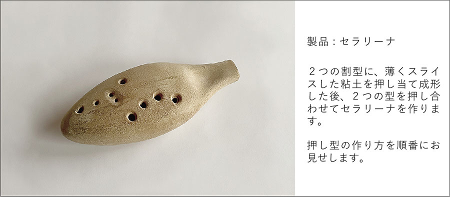 石膏の割型それぞれに板状にのばした土(タタラ)を乗せて型に押し付けた後、2つの割型を押し合わせて成形する技法で、非回転体やレリーフがついた形状を小さな規模で量産するのに向いています。陶製のオカリナ‘‘セラリーナ”を例に、石膏型のできるまでを紹介します。
