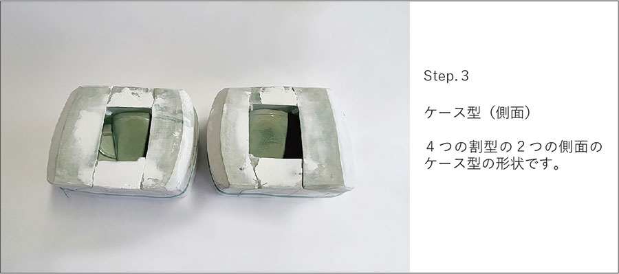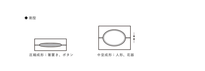 石膏の割型それぞれに板状にのばした土(タタラ)を乗せて型に押し付けた後、2つの割型を押し合わせて成形する技法。小型で単純な形状を少量生産するのに適している