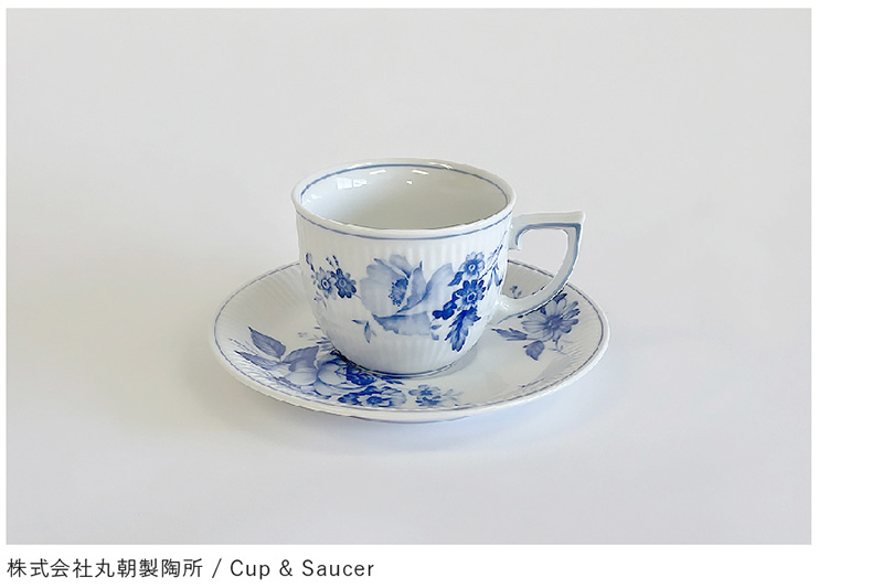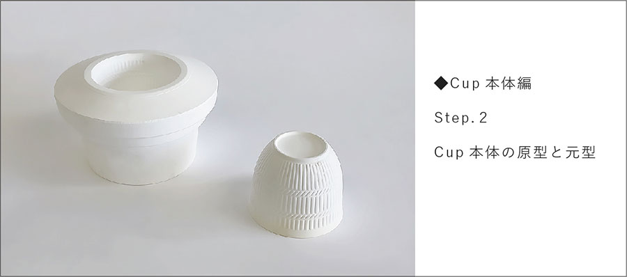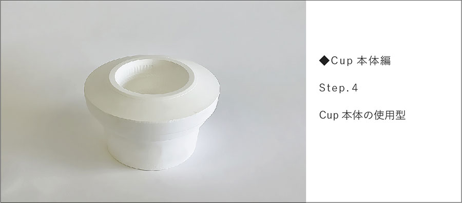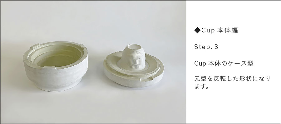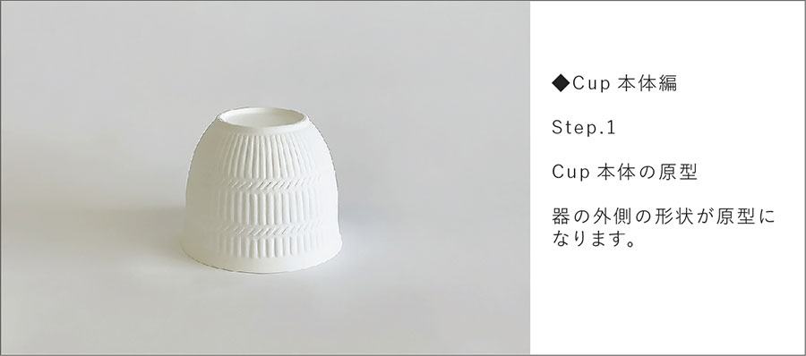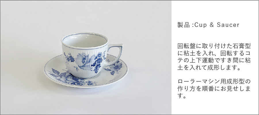回転するコテの上下運動が機械化され、回転円盤状のコテで潤滑水を使用せずに石膏型に粘土を圧延して「機械式全自動」で成形する技法。お皿などの浅い器は内側を、お茶碗、丼など深い形状は外側が石膏の面になります。Cup&Sucerを例に、Cup本体の石膏型ができるまでを紹介します