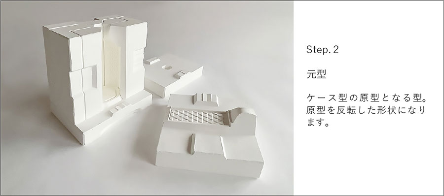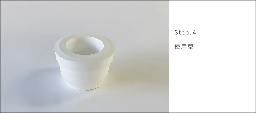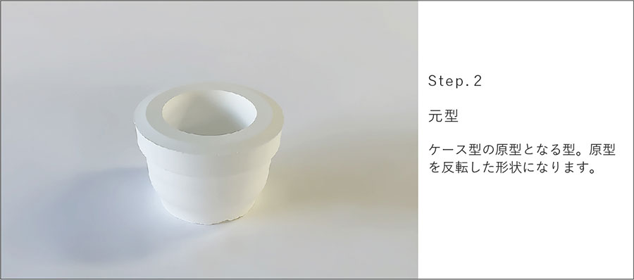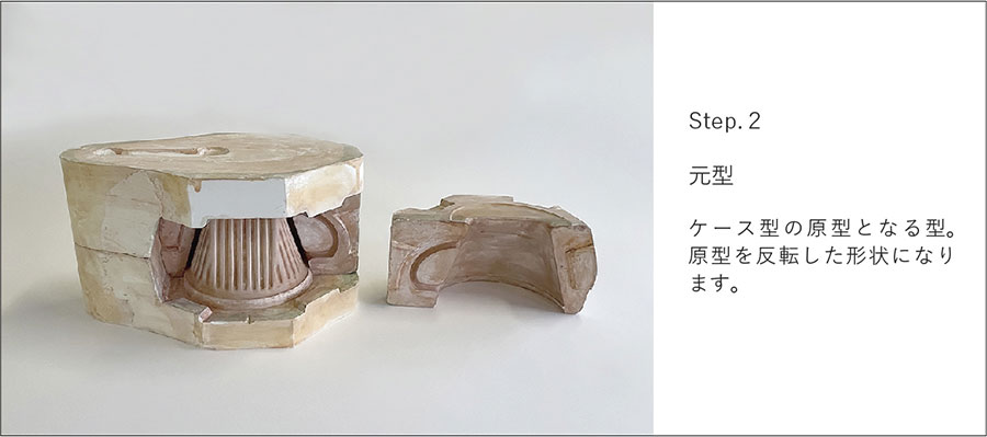 石膏型の製造工程においてできる型の種類は4段階に分けられます。最初に、求める形状である「原型」を作ります。陶磁器は生素地から焼成までに10~15%の収縮があり陶土の性質、焼成温度、焼成方法などを加味し、原型に反映させるため技量が要求されます。次に、原型を反転させ素地をつくるための使用型の原型にあたる「元型」を作ります。次に、素地を作るための使用型を量産するための「ケース型」を作ります。最後に、求める素地を量産するための型である「使用型」を作ります。石膏成型の制作工程においてできる型の種類は以下の4種類です。排泥鋳込み成形の石膏型で説明します。