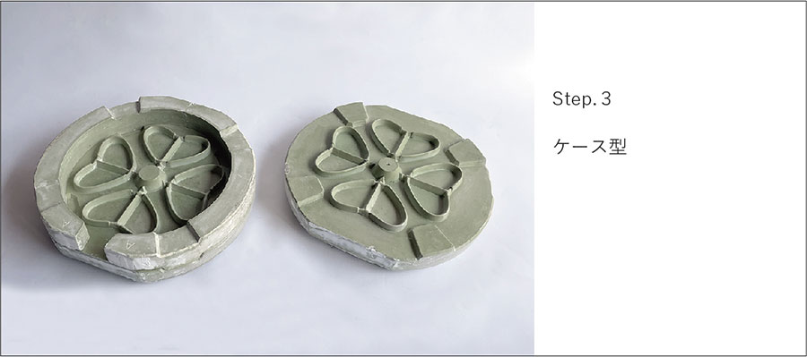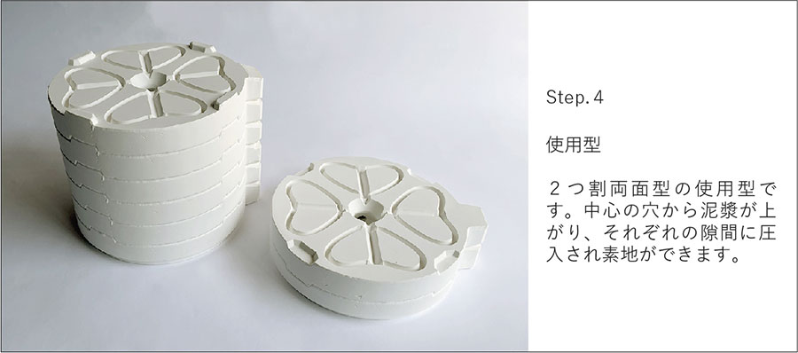 石膏型を積み重ね、型の両面の隙間に泥漿をエアーポンプで圧入し、脱水硬化後脱型する方法です。求める外側、内側の形状の隙間に泥漿を圧入することから、二重鋳込み成形法とも言われます。両面型は圧力鋳込み型の2つ割から派生した技法で、小さい素地を量産する際に使用型の型数を減らすために開発されました。