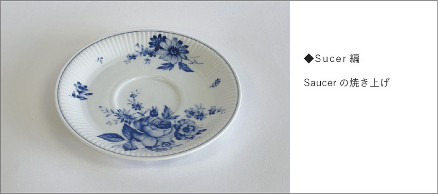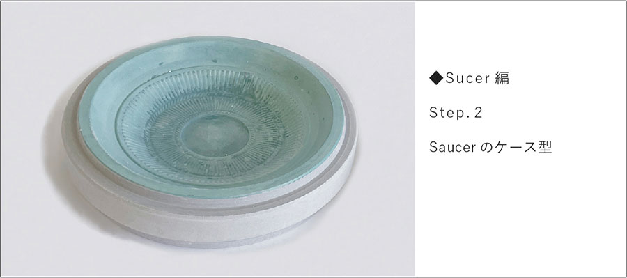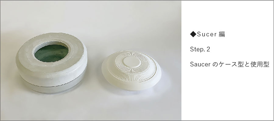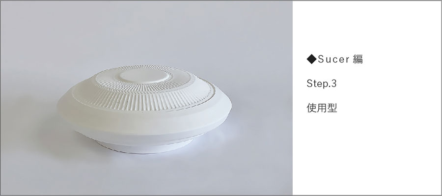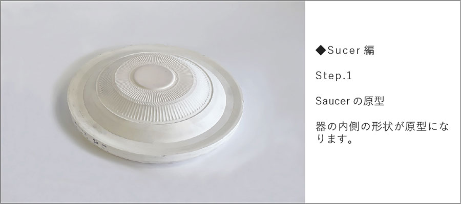 回転するコテの上下運動が機械化され、回転円盤状のコテで潤滑水を使用せずに石膏型に粘土を圧延して「機械式全自動」で成形する技法。お皿などの浅い器は内側を、お茶碗、丼など深い形状は外側が石膏の面になります。Cup&Sucerを例に、Sucer(皿)の石膏型ができるまでを紹介します。