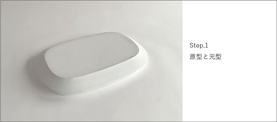 石膏型の上に板状にのばした土(タタラ)を乗せて、型に押し付けて成形する技法で、非回転体やレリーフがついた形状を小さな規模で量産するのに向いています。“パンのお皿”の型を例に、石膏型のできるまでを紹介します